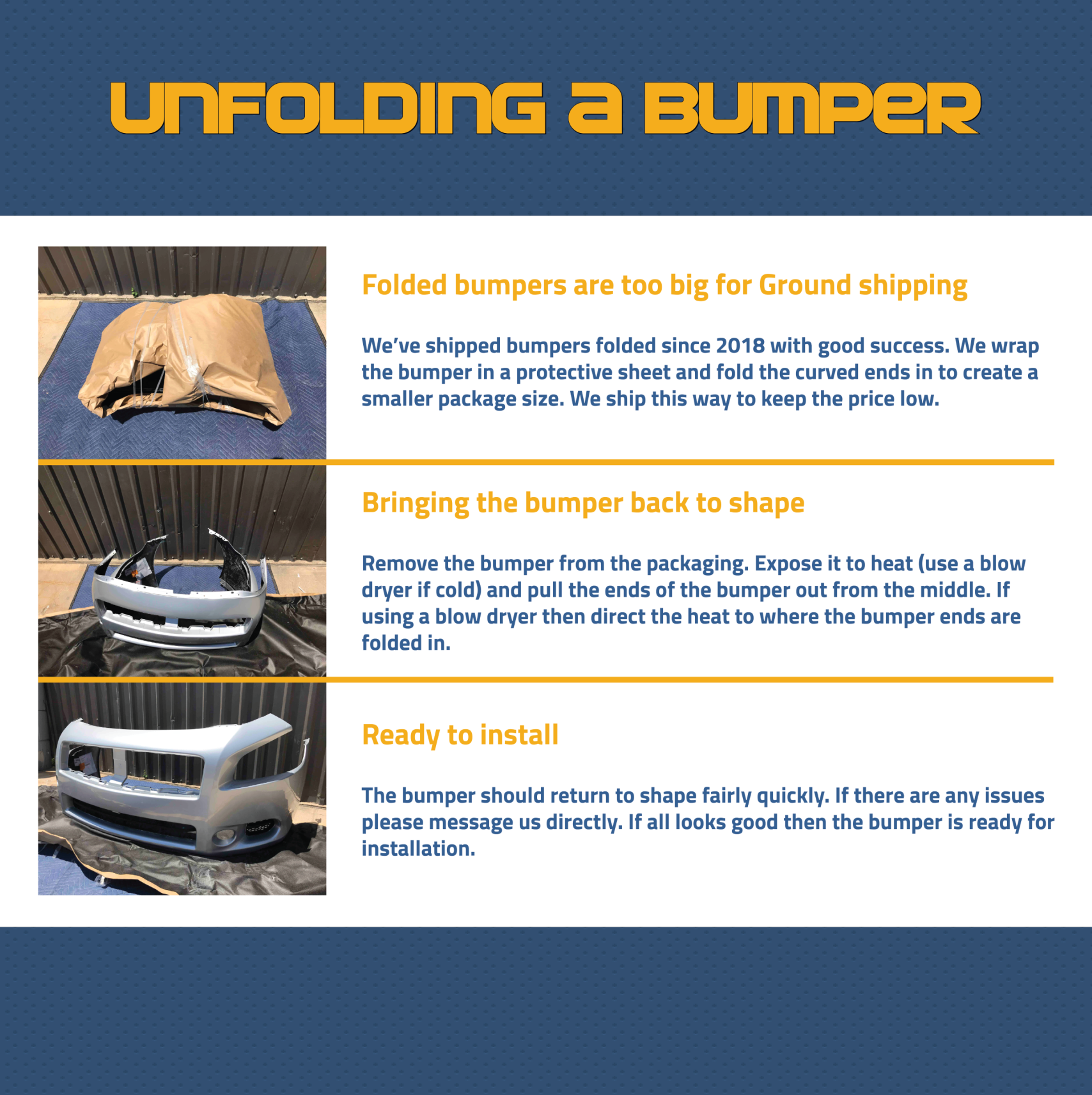 Kindly note that in order to ship our painted bumpers for free, said bumpers must be folded for transit. Our bumpers are made of thermoplastic material and can easily be reshaped to its original orientation. While in uncommon cases, this may cause some imperfections to the paint, this is the ideal method to delivering pre-painted bumpers while saving you expensive additional fees.